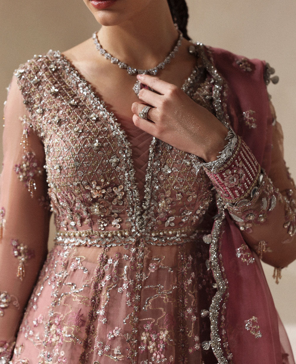 In dreamy dusty peach, this organza paneled pishwas captures the essence of feminine grace. The bodice shimmers with an intricate silver sequin jaal, while cascading panels bloom with delicate floral embroidery framed in soft pink satin for a whisper of refinement. Paired with an ethereal pink organza dupatta, the ensemble exudes quiet grandeur, a perfect harmony of charm and sophistication, designed to leave a graceful impression wherever you go.