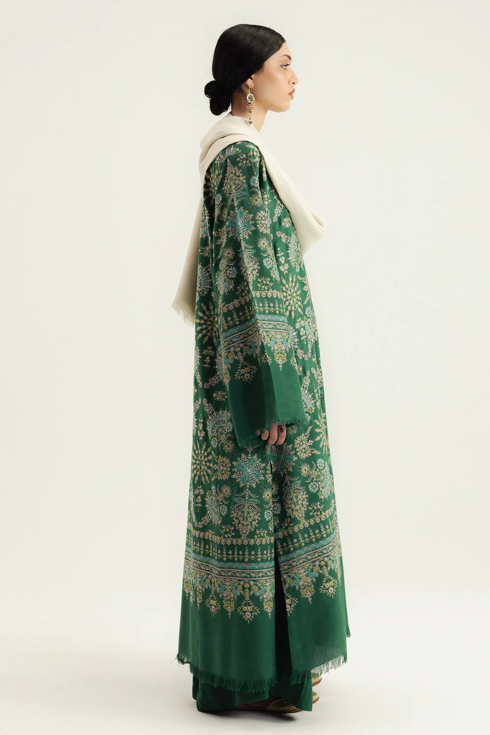 A green marina shirt featuring all-over embroidery on the front and back, showcasing fine craftsmanship and elegant detail. Paired with a contrasting ivory marina shawl embroidered on the pallus and matching marina trousers, this ensemble combines rich color with timeless sophistication.